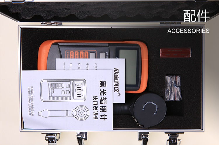 專業(yè)精良的黑光輻照計,探測器的光譜:360nm到460nm(峰值405nm,50%以上透過率波段382nm到428nm)。